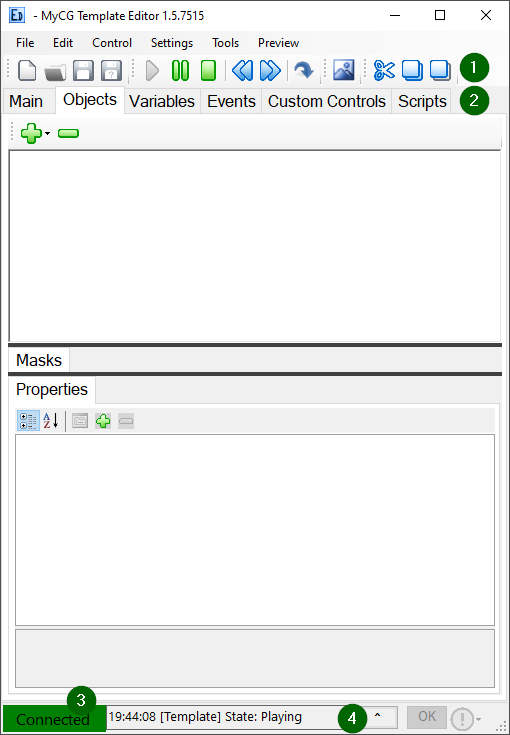 A MyCG Rendering Engine-hez való csatlakozás állapotát jelző ikon. - (4) Üzenetek terület: