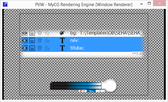 A névinzeren már látni kellene a szöveget. Mi azért nem látjuk, mert ugyanaz a Position.Z tulajdonsága mind a 3 objektumnak és a MyCG Rendering Engine a hátteret rajzolja utoljára.