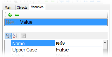 A listában a változó neve mellet az aktuális értékét láthatjuk. Ezt az értéket a Value tulajdonságal módosíthatjuk. - A változókat rendeljük hozzá a Text objektumokhoz. A "név" objektumhoz a "Név" változót, a "titulus" objektumhoz a "Titulus" változót.