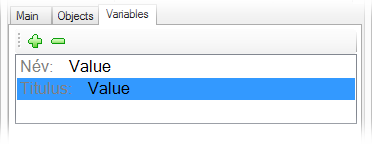 A Variables fül kiválasztásaával látható a sablonhoz definiált változók listája. Adjunk hozzá egy-egy változót a névnek és titulusnak. Ezt a
