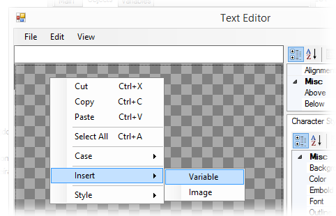 A Text Editor-ban a Szöveg szerkesztő részben jobb egérgombal kattintva, a legördülőmenüben válasszuk az Insert menü Variable menüpontját: