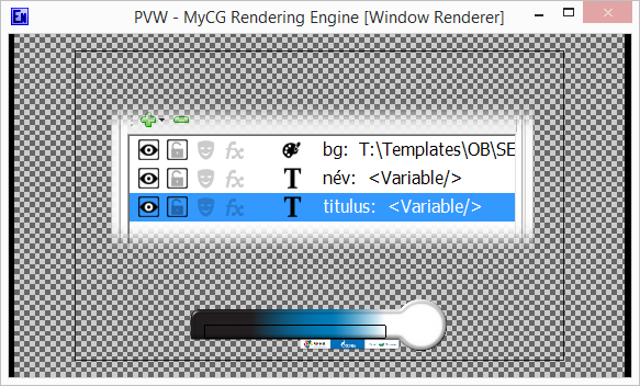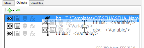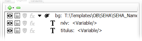 Névinzert sablon létrehozása. A sablon tartalmaz 1 db képet (az inzert hátterét) és 2 db Text objektumot (név és titulus sora).