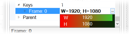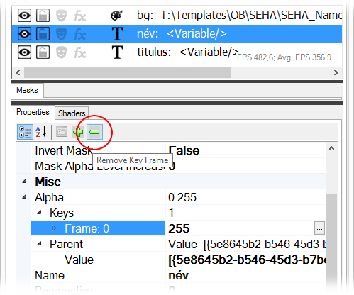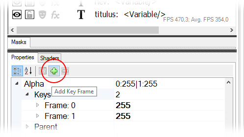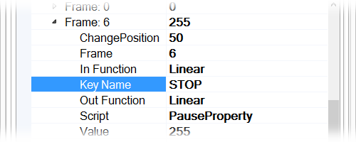 Az új key frame az 1. képkockához került. Állítsuk át a Frame tulajdonságát a 6. képkockára, majd a Value tulajdonságát 255-re (100%-os alpha).