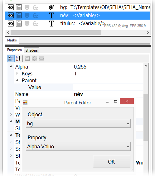 A Parent Editor ablak a Parent Value tulajdonsága mellet található