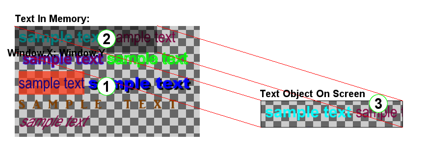 - 1. A memóriában lévő teljes szöveg. Nem látható teljesen, ha a Text Objekum (3) mérete kisebb mint a teljes szöveg mégete.